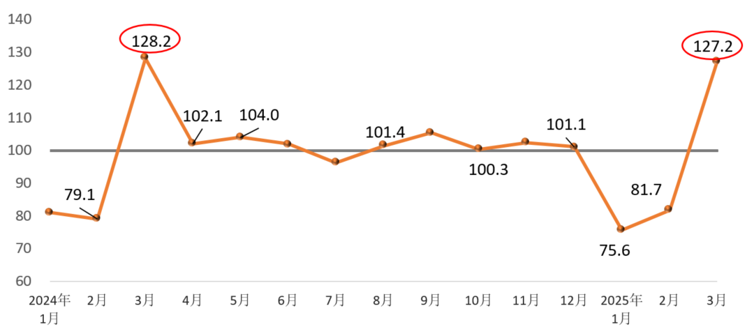 2025年3月份建筑材料工业景气指数为127.2点,高于临界点,处于景气区间,比1、2月份明显回升,回升幅度不及上年同期。